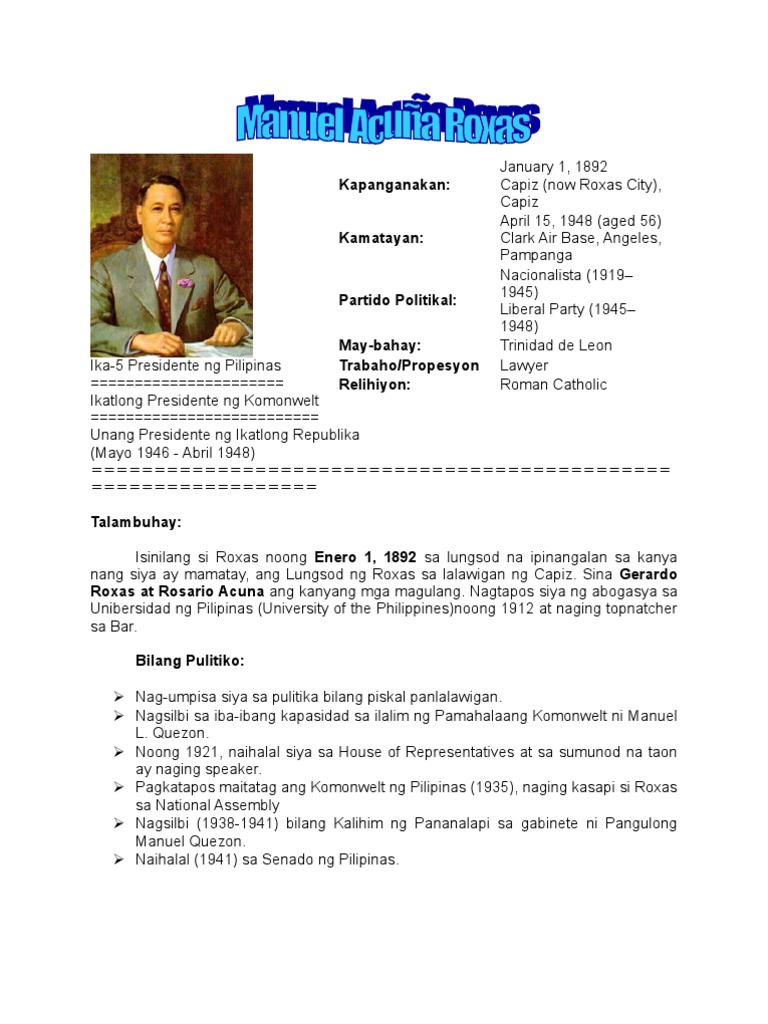 Alamin ang talambuhay ni manuel l quezon. In 1910 Roxas started taking up law at Young Mens. Quezon din ang kauna-unahang presidente ng senado ng Pilipinas na naging pangulo ng bansa. Quezon Download Now Download.