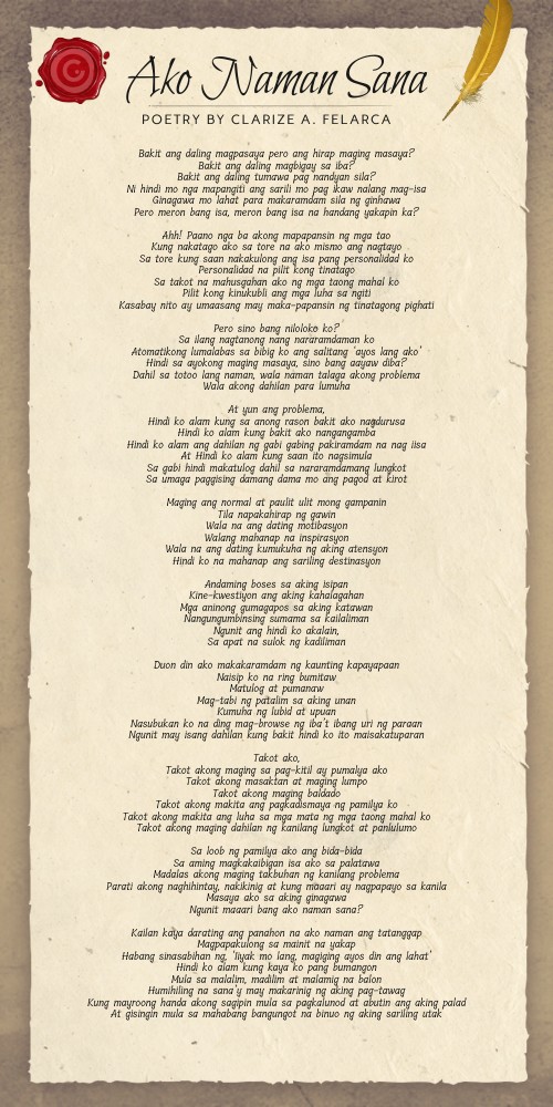Nagpa-Felix Bacat si Kristof Garcia noong Oktubre 27 Miyerkules sa Instagram. Tagged filipino literature love poems poetry prose sulat pinoy tagalog poem tagalog poetry tula writing Kapag Ako ang Pinili Mo February 16 2017 February 16 2017 quirkyshine Leave a comment. Na gawing gabi ang lahat ng umaga Na kasing dali lang kung paano mo nakayanan Na maging malungkot ang dating tayo na masaya.