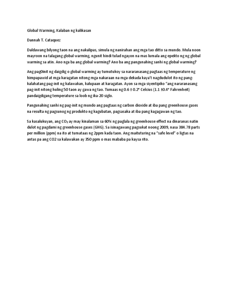 Ano ang sanhi ng climate change sa kapaligiran. HAMON NG KALIKASAN. Dahil sa madaling tablan ng mga epekto ng climate change ang Pilipinas maaaring matinding maapektuhan ang mga naipundar na kaunlaran sa ekonomiya ng Pilipinas. Ang pangunahing sanhi ng climate change ay ang pag laganap ng tinatawag na greenhouse gases sa ating kalawakan.