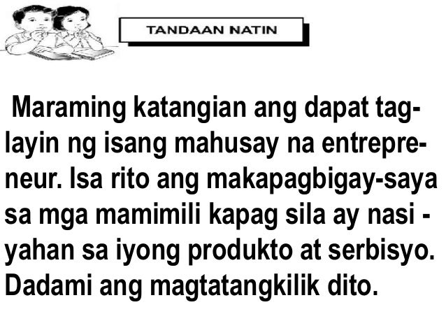 Ngunit para sa ating layunin ang dalawang nabanggit ay ating ituturing na magkasingkahulugan. 8 Bumuo ng pangkat na may tatlong miyembro at isadula a ang mga katangian ng entrepreneur b mga gawain sa pamamahala ng negosyo at c pagtatala ng mga paninda. Meron kasing mga natatanging katangian ang mga entrepreneur na nagtatagumpay.