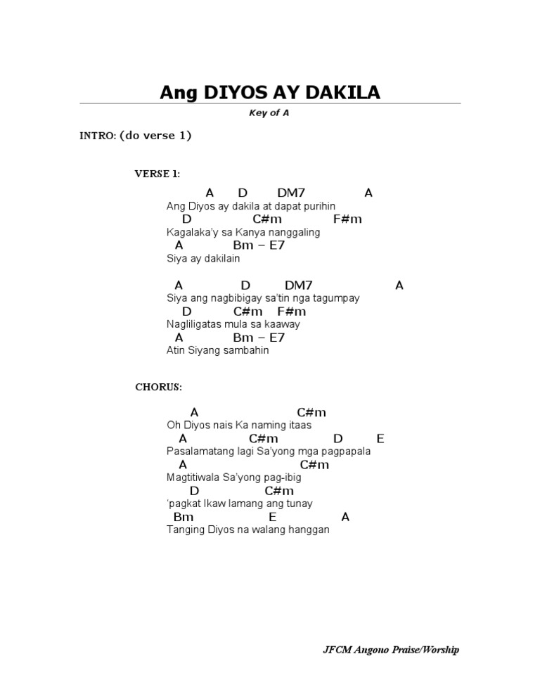 Aking diyos na dakila dakila ang iyong pag ibig. Db Dakila Ka O Diyos. Pag-ibig moy walang hangan repeat Chorus Dakila ka O Diyos. Psalmer Pagalan Himig ng Lahi Intro E A EG A E A EG A Verse 1 E Fm7 EG A Matatag ang puso ko A Cm7 DM7 Aawit pa rin saYo E Fm7 EG A Gising na kaluluwa A Cm7 DM7 Gisingin ang bukang-liwayway Pre-Chorus Bm7 E7 sus E7 O Panginoon pupurihin Kita Bm7 E7.