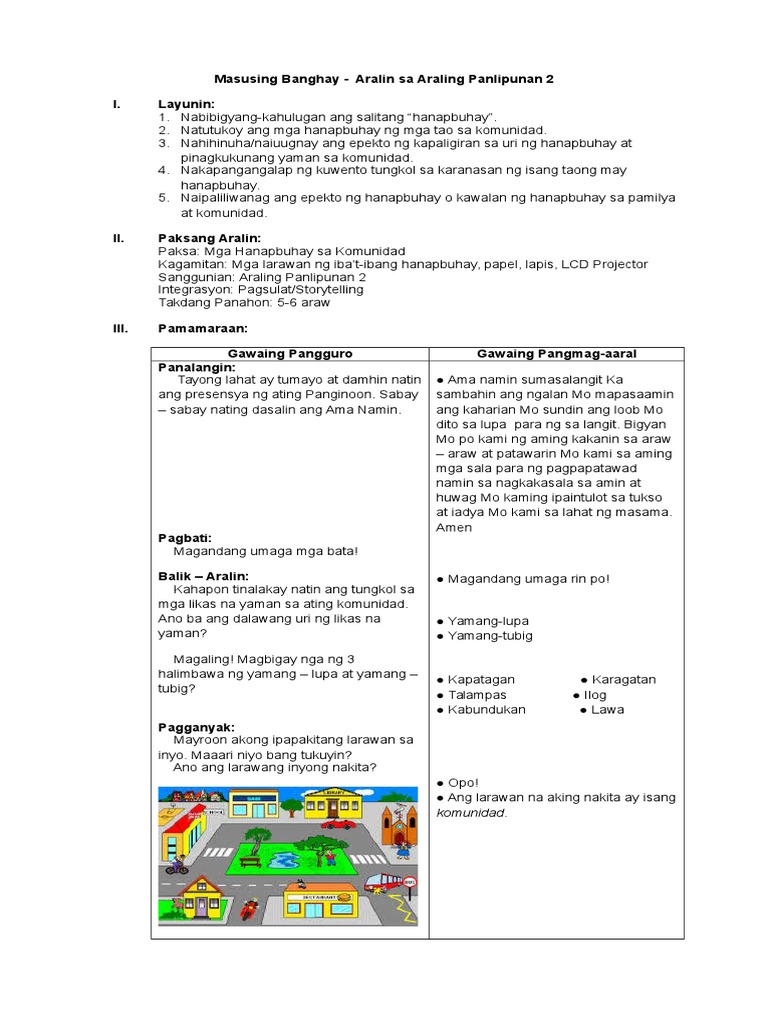 A detailed lesson plan is a thorough description of a teachers instructions for a particular class. Maaaring binubuo ito ng mga simbahan paaralan ospital at iba pang establisyemento brainlyphquestion582317. Para sa Araling Larawan ng Aking Komunidad Narito ang awit na naaangkop sa aralin.
