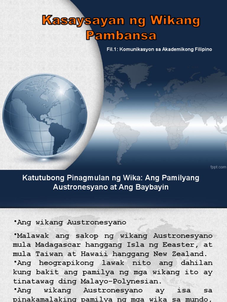 Ang Wika sa Ibat-ibang Panahon Ang bansang Pilipinas ay binubuo ng mahigit sa 7000 pulo at may 87 wikang ginagamit ang mga mamamayan noon kaya mahirap silang magkaunawaan at madalas na may alitan. 24062016 Ipinahayag ring ituturo ang wikang pambansa sa mga paaralan sa buong Pilipinas na nagsimula noong Hunyo 19 1940. Panahon ng sa mga nasalanta ng Nakasentro sa mga Liberasyon digmaan gawaing pang.