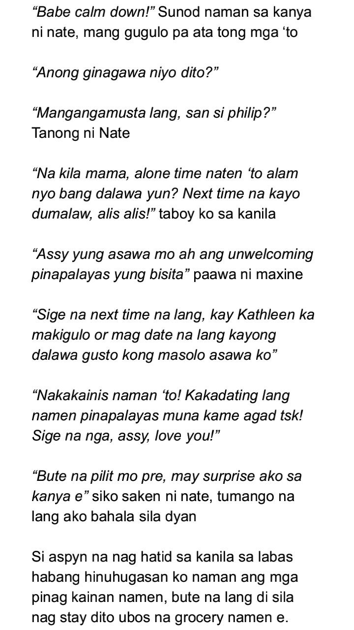 Nakapila ko sa check in lane at ung NAIA employee sinigawan ako kasi kulang ung info. Mmmmm sabik na ako sa iyo ang bango mo mmmm sabi ni Jason nang yakapin niya ang nakatagilid sa kanyang si Gwen. Tumingin ako sa sahig.