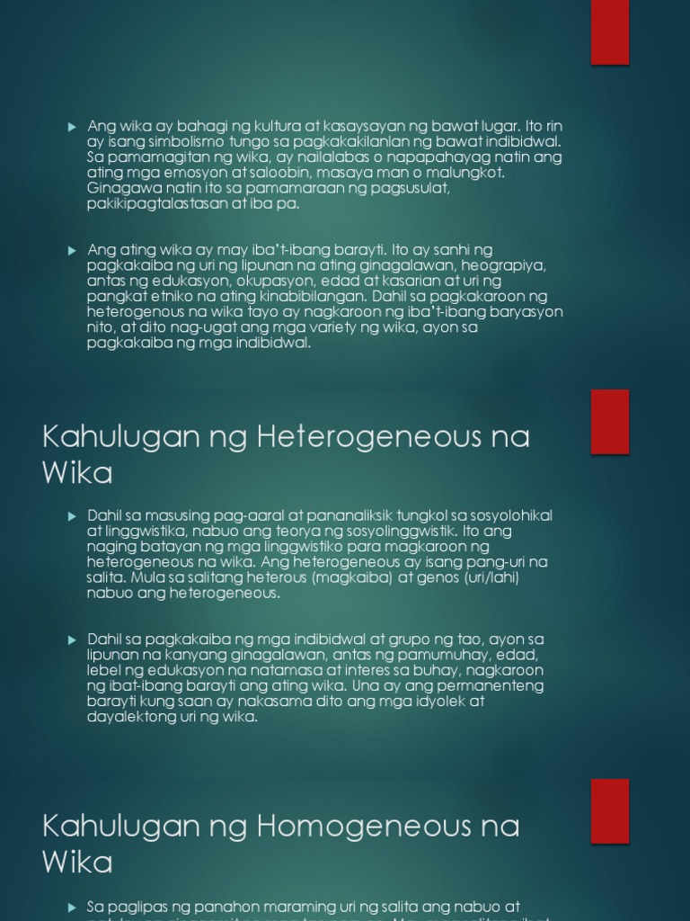 Narito ang mga gabay sa rehistro ng wika sa ibat ibang sitwasyon at larangan. Kilala rin sa Ingles na variety ito ang snhi ng pagkakaiba ng uri ng lipunan nating ginagalawan heograpiya edukasyon okupasyon edad kasarian at kung minsan ang uri ng pangkat etniko. Dahil sa pagkakaroon ng heterogenous na wika tayo ay nagkaroon ng ibat-ibang baryasyon nito at dito nag-ugat ang mga variety ng wika ayon sa pagkakaiba ng mga indibidwal.