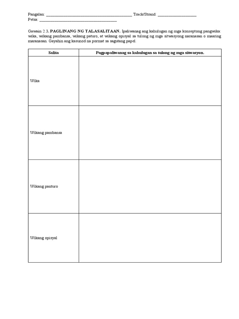 Ipaliwanag ang kahulugan ng mga konseptong pangwika. Ang wika ang nagsisilbing instrumento upang maipahiwatig natin ang ating mga sagot sa mga katanungan na atin ring magagamit sa ating mga trabaho sa. Ito ang nagsisilbing tulay ng mga tao tungo sa pagkakaintihan.