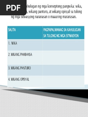Wika wikang Pambansa wikang panturo at wikang opisyal sa tulong ng mga sitwasyong nararanasan o maaaring maranasan. Sa paggamit ng ating sariling wika sa mga transaksyon sa ekonomiya mas magiging madali para sa mga mamamayang pilipino ang makahikayat upang.