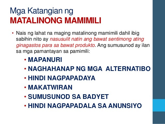 Mga Tungkulin ng Isang Mamimili 5 Pagiging mulat mapagmasid at alerto. Pamantayan Sa Pagiging Matalinong Konsyumer. Karapatan sa pagtuturo tungkol sa pagiging matalinong mamimili.